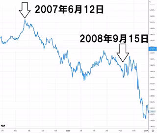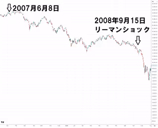 リーマンショックの金融危機は2008年9月15日以降、短期間に暴落しましたが、そこがスタートではありません。