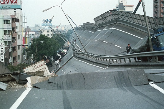 完全に倒壊した阪神高速道路神戸線(兵庫・神戸市東灘区)