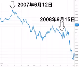 2007年6月12日に10年米国債の金利はピークを付けて反転し金利低下(信用収縮)が始まりました。